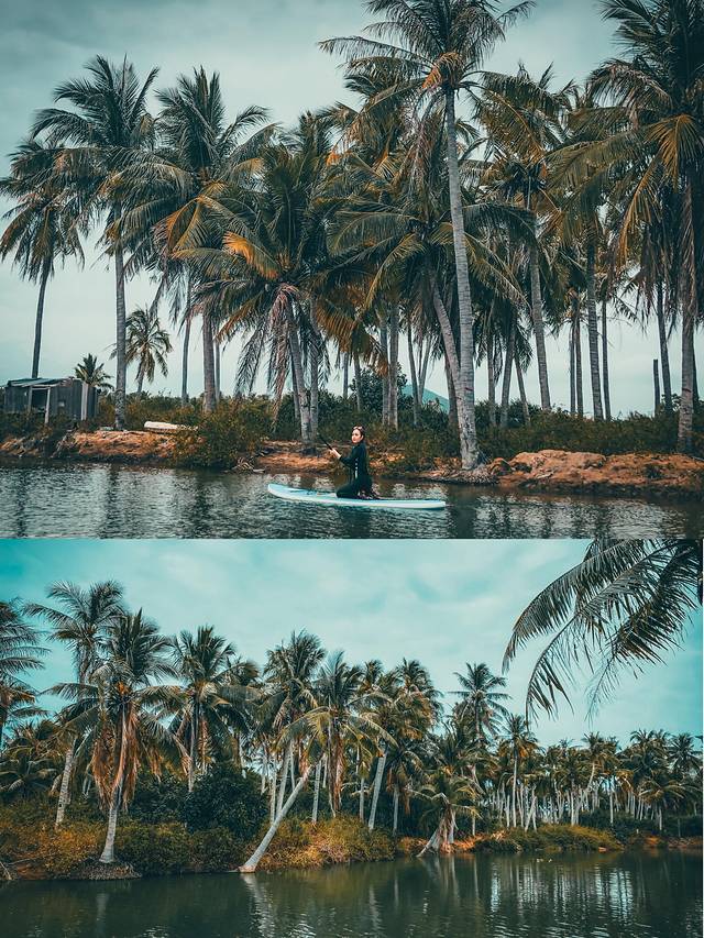 我们这一队有6个人,这一路的奇遇特别好玩,先是抱着桨板来到河道口上板。然后悠闲地划着桨板,穿行在椰子洲河上,有的姑娘甚至能站起来划行,真的很羡慕,这一路的景色真的超好!水是那种很好看的孔雀蓝,河道两盘都是没人打扰的椰子树肆意生长,据当地村民说,这些椰子树看着不大,但树龄都是他们爷爷辈的。