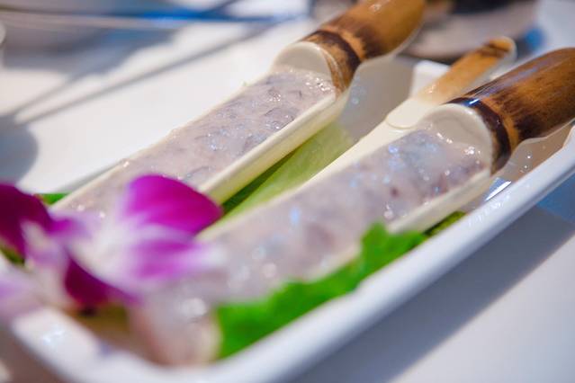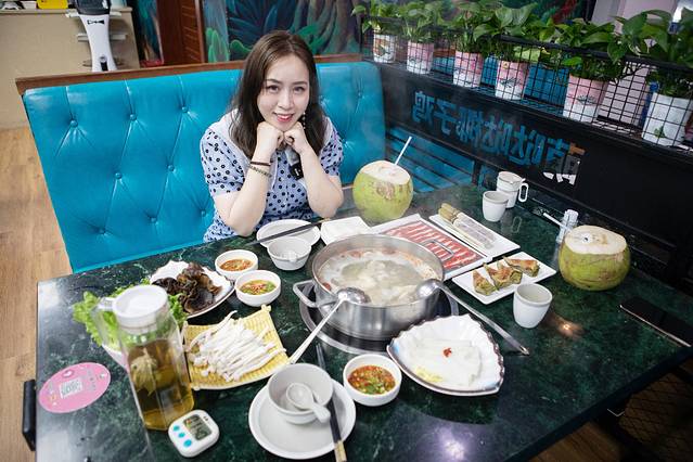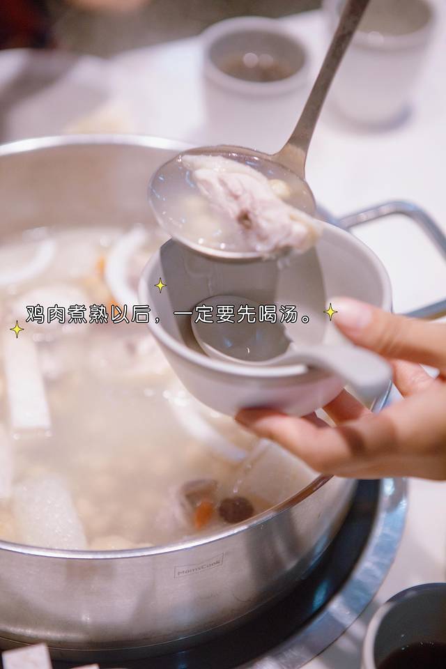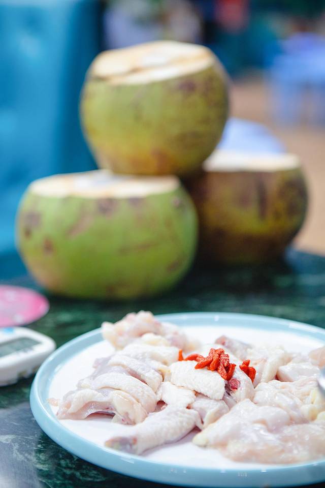 进店选择了一个双人套餐,现切的椰汁用作汤底,服务员怕我会吃不惯甜口的,给我还加了一瓶矿泉水,煮开后放入鸡肉,鸡肉在椰汁中煮的格外嫩滑,带着一些椰子清甜的味道,咬下去鸡肉会爆汁~