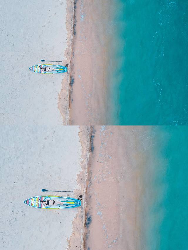 1.椰子洲岛上的沙滩,拍浆板+比基尼的俯视,航拍的效果太棒了