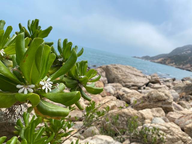 下午四点以后太阳不那么暴躁了才出门,沿小路走到悬崖边,天蓝得通透,水清得透明,随手拍都是大片