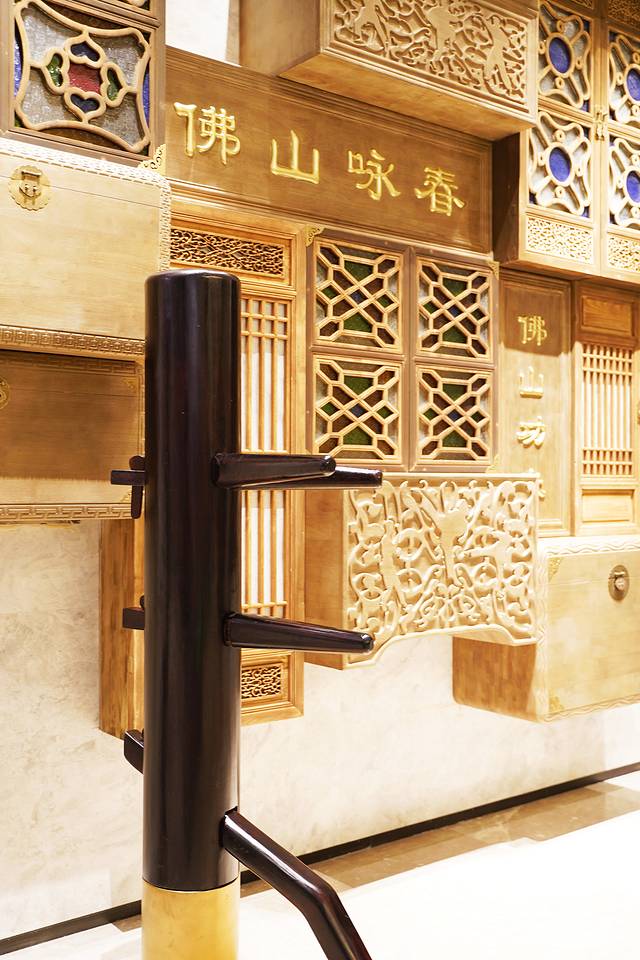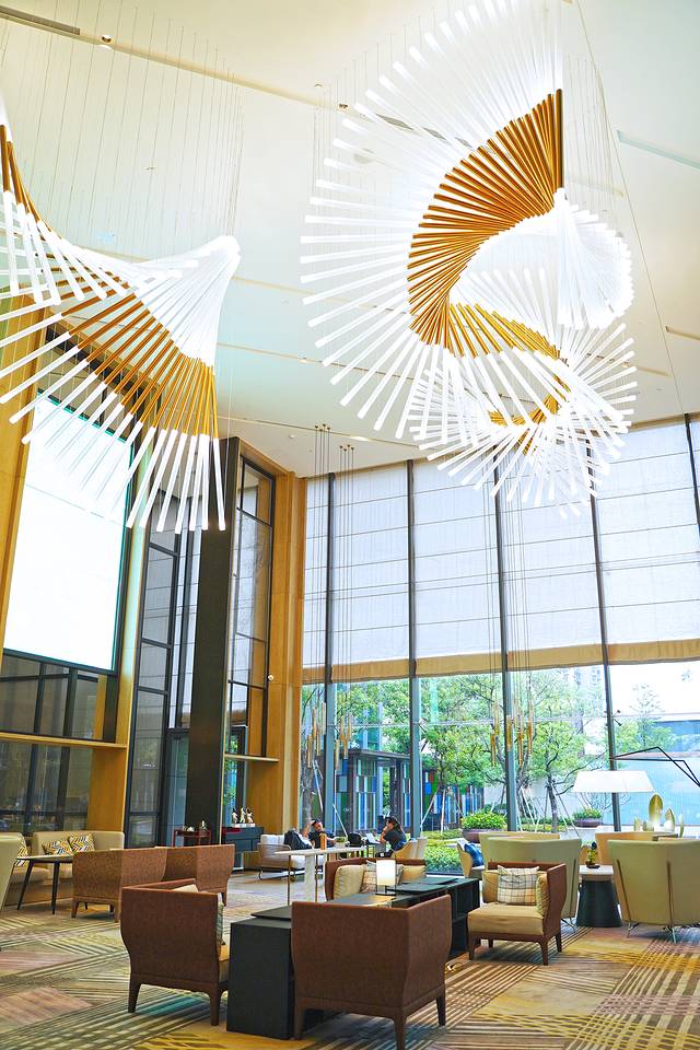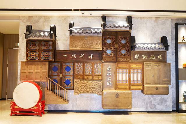 酒店大堂上方的灯饰是比较惊艳的,参照武术棍花元素设计的富有层次感的灯饰,将舞棍的婆娑动感表现得淋漓尽致,灵动写意。电梯间也加入了佛山岭南特色的艺术摆件,牌匾、木窗、咏春木人桩,不经意间就将佛山的过去和现在娓娓道来。