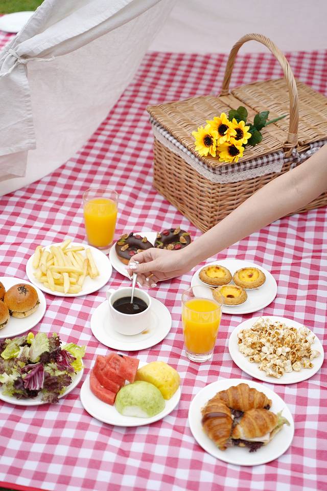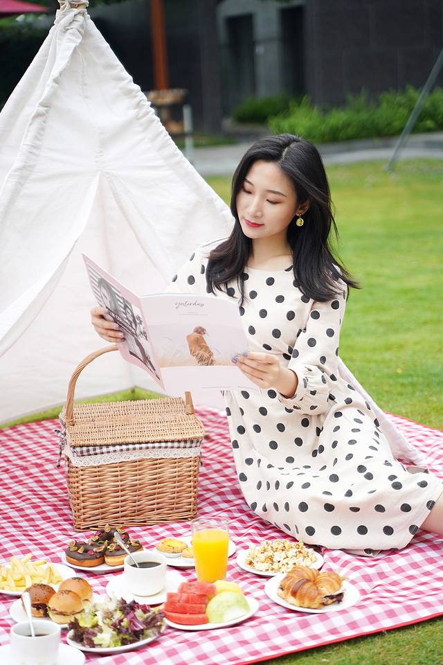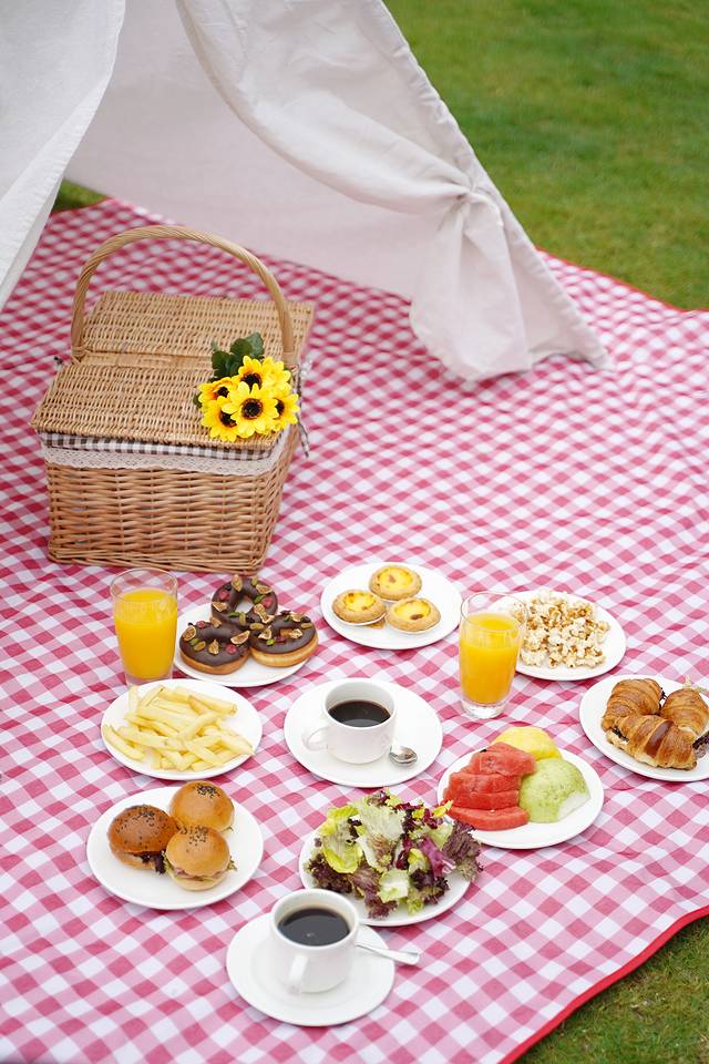 沐浴在温暖的阳光下,享用精致的甜点小吃以及饮品,在撑起的Ins风帐篷和野餐篮、野餐垫的映衬下,绝对能拍出一组高颜值的户外野餐大片~