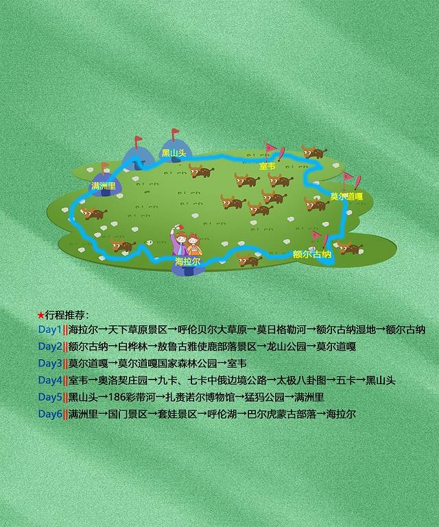 本身自己就是爱做一些旅游攻略,找我要旅行攻略的也不少(私信我免费领取)自己就随便联系了一位身在呼伦贝尔的朋友,让他开车送我们到每个地方玩一玩,我做的行程是北环线5天4晚游玩攻略、没必要玩太久,时间充裕的话可以在满洲里住下,欣赏夜里的满洲里、我们的行程是从海拉尔出发,途经:海拉尔·额尔古纳·室韦·黑山头·满洲里·海拉尔北环线、