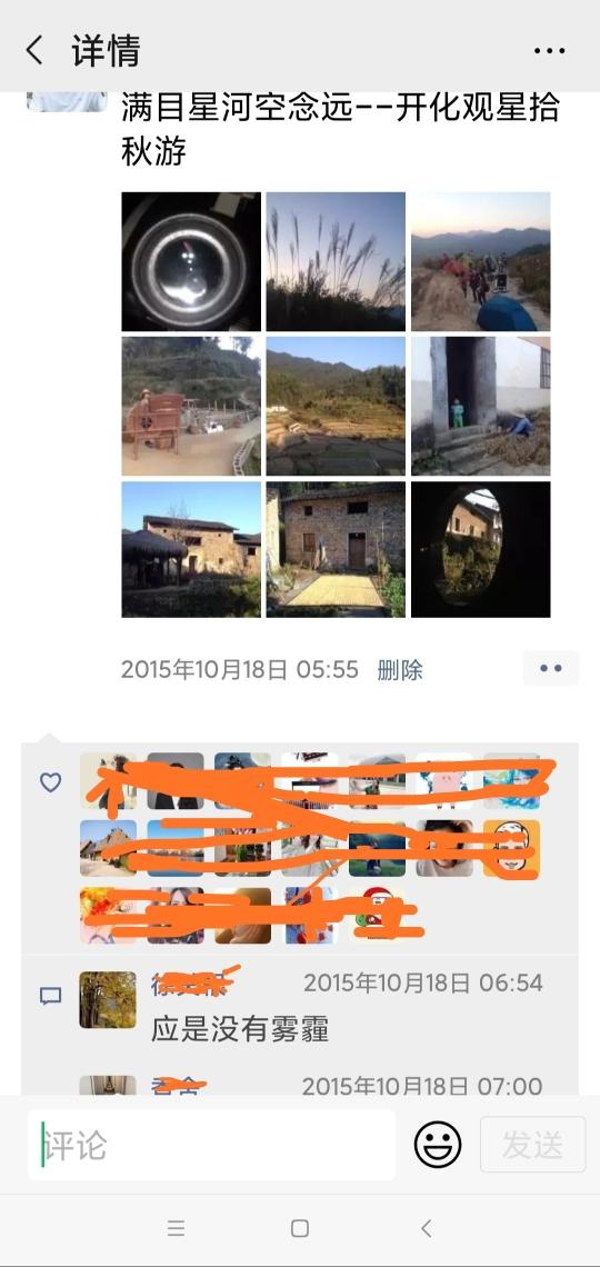 最近一次去,是杭州市天文学会组织的天文爱好者观星活动,去的是长虹乡高田坑自然村,那儿因为空气质量好,星空常年可见,地处高山又有平地,便于观星,所以已被天文学会列为观星基地。现在的手机真是智能了,记得当时发的微信朋友圈标题“满目星河空念远”,是改自宋代著名“宰相词人”晏殊的“满目山河空念远”,所以微信上输入“满目星河空念远”一下就搜到了自己当时发的朋友圈----2015年10月18日,截图及当时拍的照片一并发于此: