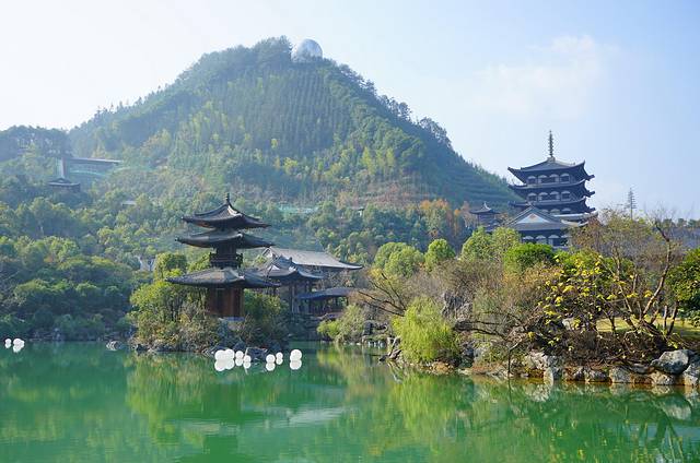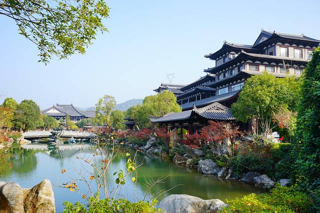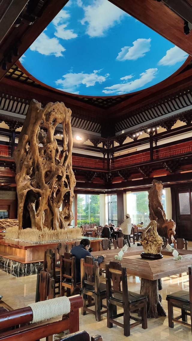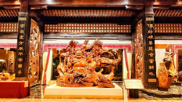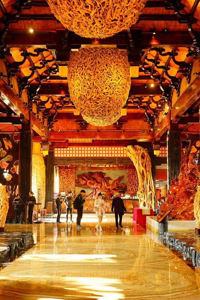 如果说醉根山房酒店是宫殿和博物馆,那么根宫佛国则是皇家园林和博物院了。它占地3.03平方公里,汇集奇石、盆景、根艺、园林古建,有福门祥光、云湖禅心、集趣斋、天工博物馆、根雕佛国、醉根宝塔、历史文化长河等近30个景点,大型根雕就有2000余件。这样的根文化旅游区,据称在世界上也是绝无仅有。