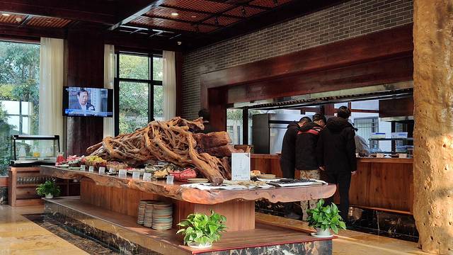 开化醉根山房酒店坐落在开化最著名的景区,国家5A级景区根宫佛国旁,依山而建,占地面积达约2万平米,以5星级标准建造,好似一座宫殿。建筑风格是大气的汉唐风格,装饰风格则是别具特色的根雕文化风格。据称它是国内唯一的根雕文化主题酒店。