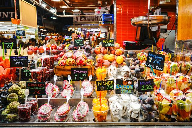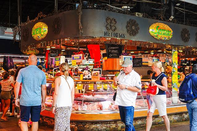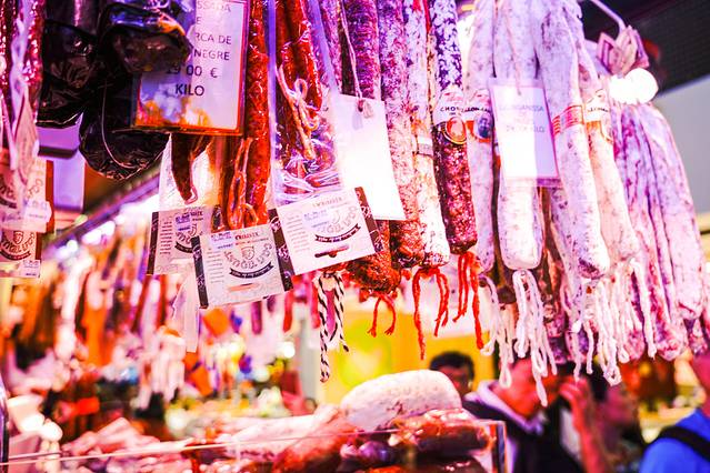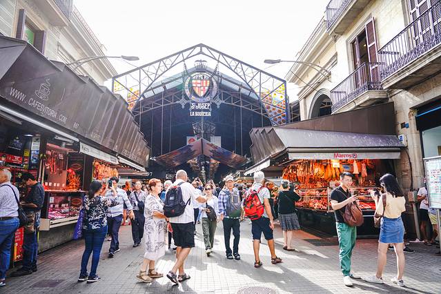 在巴塞罗那,波盖利亚市场就位于兰布拉大道中段。可以看到是在2栋楼的中间呢。不过门口这些熙熙攘攘的人群就知道,里面能是啥样!