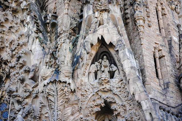 圣家堂有三个立面:诞生、受难、荣耀立面,分别对应《圣经》中耶稣诞生、受难、升天三个重要故事。参观圣家堂的入口在诞生立面。诞生立面的建筑是为了纪念耶稣的诞生,因此面向朝阳。外部的雕刻精致写实,呈现出了喜气洋洋的景象。