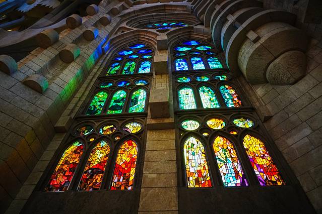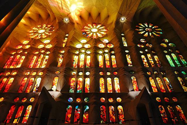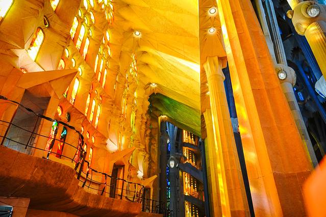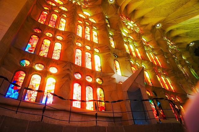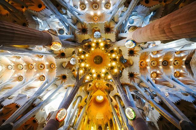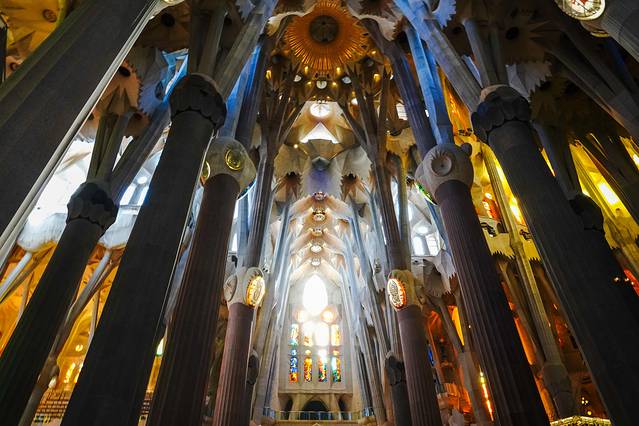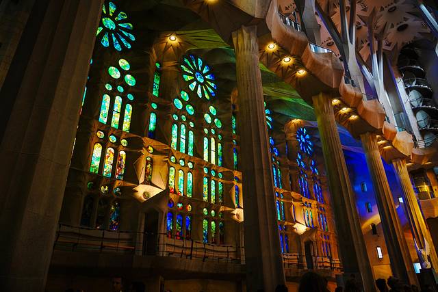 走进圣家堂的内殿,如同走进一座异彩纷呈的奇幻森林。无论之前在网上看过多少图片都是浮云,只有亲自站在这座圣殿之中,抬头仰望,四下环顾时,才能感受到一种发自内心的赞叹,我是一进来我感觉就要跪下!难怪当时信徒那么虔诚,当你进入的时候你也会相信耶稣了!
