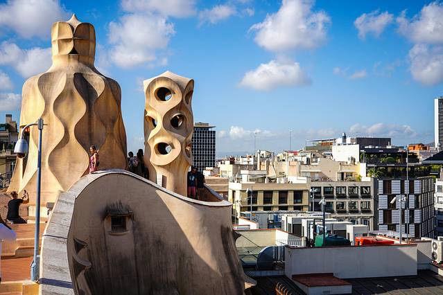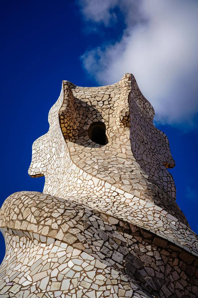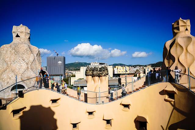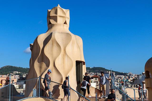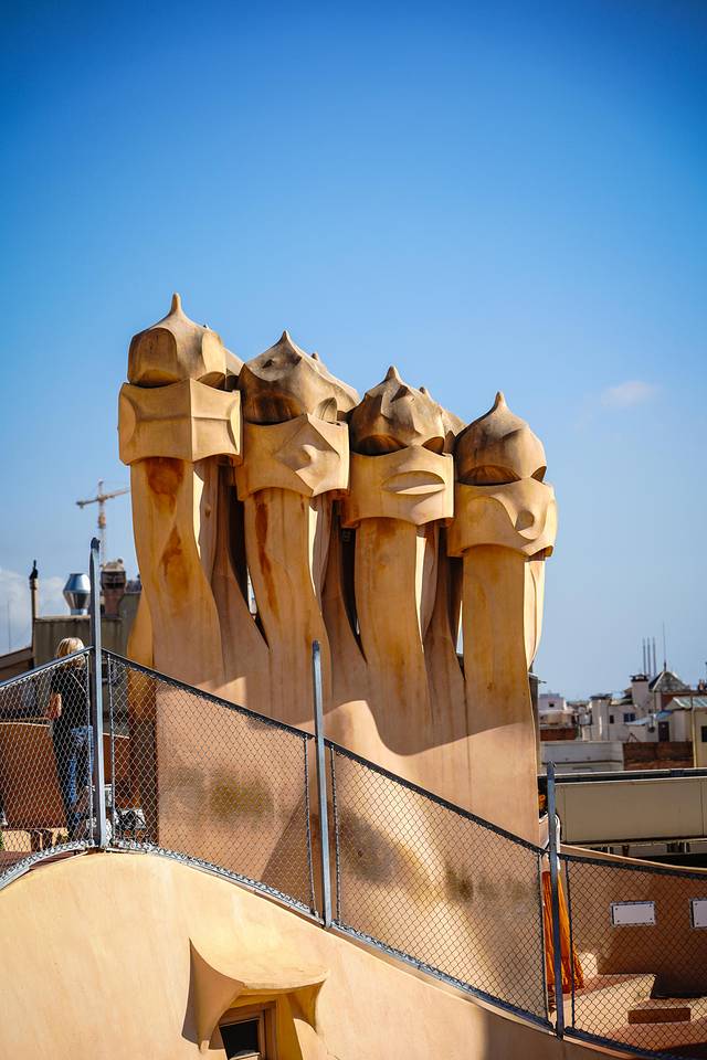 进入之后我们直接乘坐电梯来到顶楼,就能发现这些造型前卫的“外星来客”威严伫立,有的像披上全副盔甲的士兵,有的像神话中的怪兽,有的像教堂大钟,恍如穿越时空,进入一个奇幻的未来世界。而这些奇特造型其实都是排烟管或水塔,高迪将其变成一个世界上独一无二的人文景观,也成了巴塞罗那的象征。