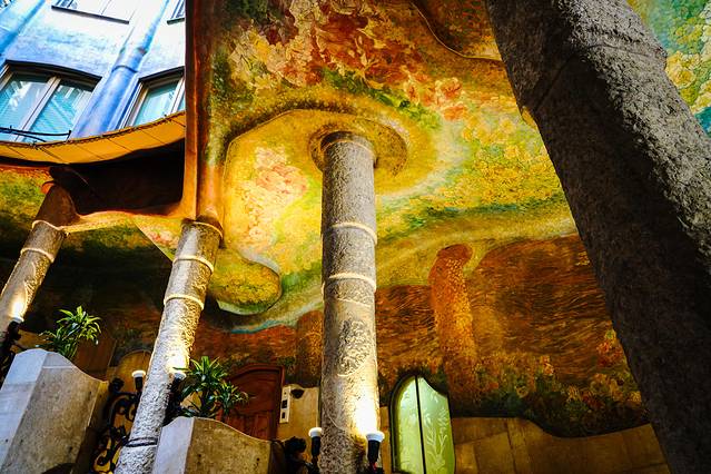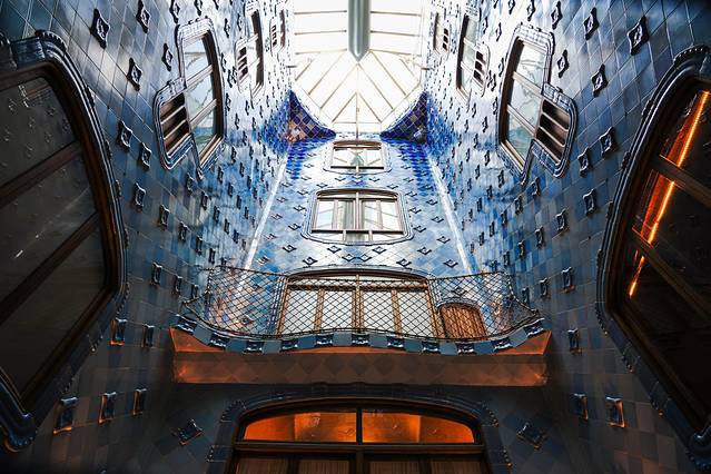 走走走继续参观路线是超级好看的日光天井,高迪将这座天井当成建筑物的外墙来进行设计。这座天井仿佛一道流光瀑布,日光跳跃在彩绘瓷砖间,从所有的空隙中进入,再洒落到地窖的天窗,光线轻抚过每一片起伏的墙面。