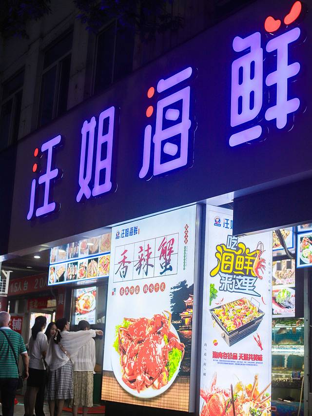 汪姐海鲜的招牌很明显,老街出来就看到街对面醒目的招牌了,虽然夜幕已经降临,但餐厅的招牌灯光熠熠,大老远就看得见,而且在整条街那么多海鲜餐厅里面,显得非常之醒目。