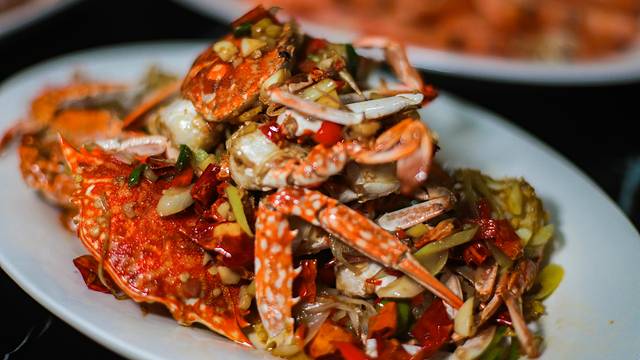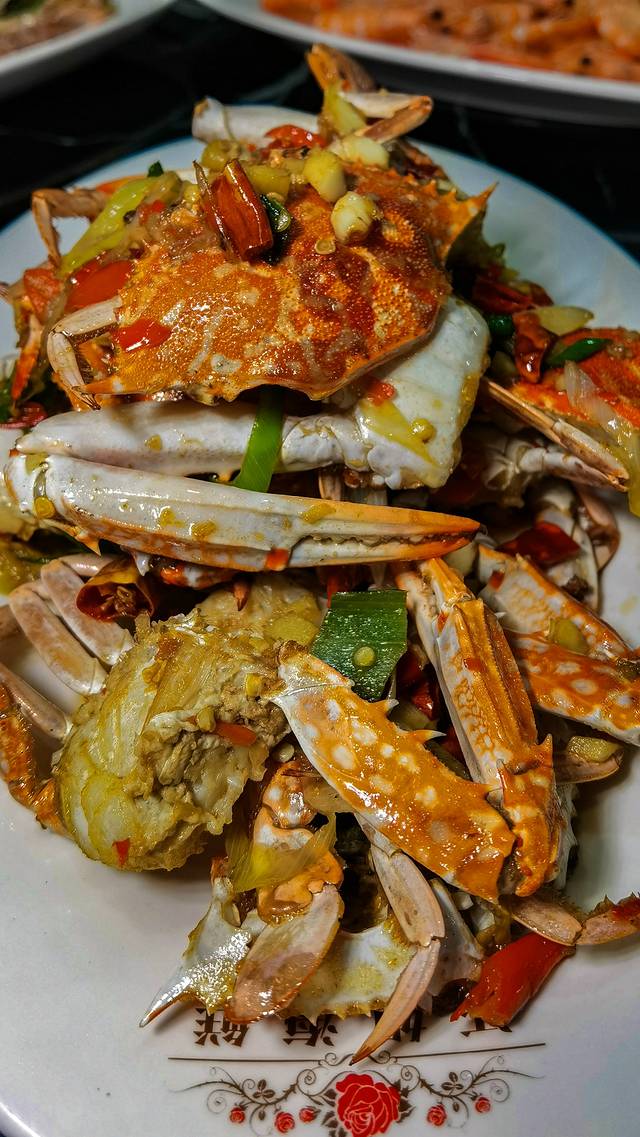 店里招牌菜香辣蟹,真的墙裂推荐,我们因为都喜欢吃辣,所以点的所有海鲜都是辣味的,最神奇的是,螃蟹这么硬的外壳,在汪姐的神奇烹饪下,竟然调料的味道完全进入螃蟹的每一丝肉质里,美味不打折。