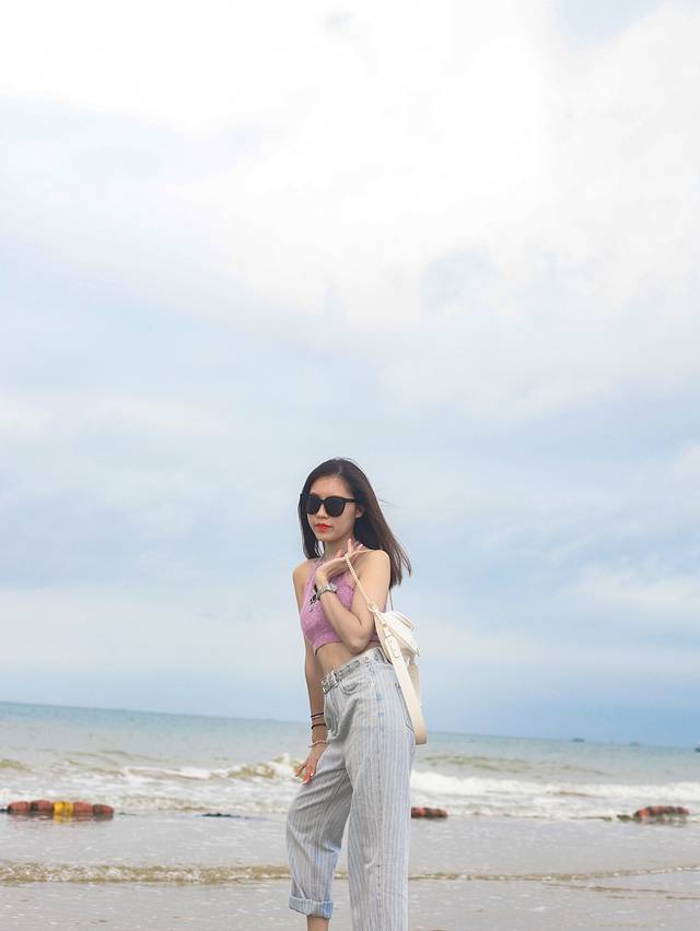侨港海滩的风光旖旎,景色怡人,沙滩由高品位的石英砂堆积而成,砂细而软,但跟银滩比起来,稍显暗淡,也或许是我们去的那天风云骤变吧,乌云之下照应的海滩颜色也更浓郁一些。