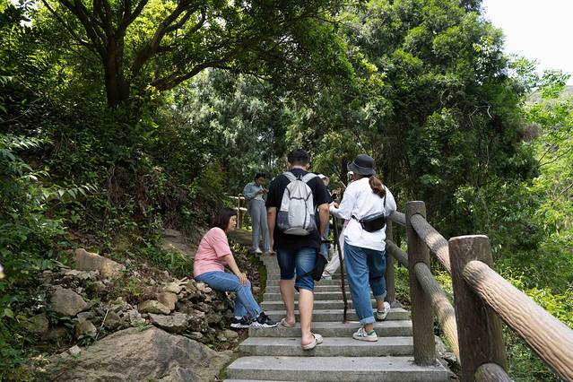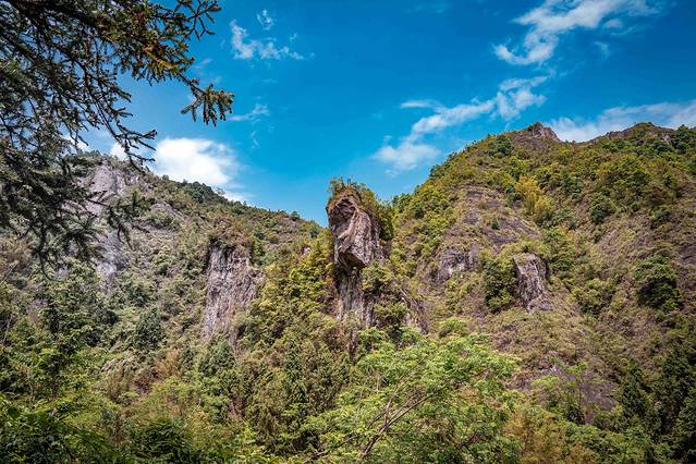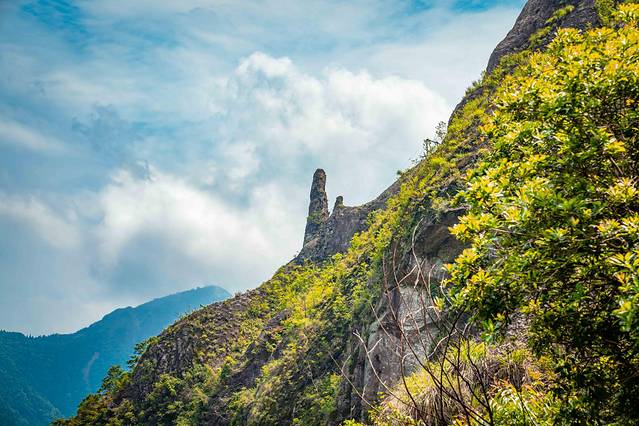 想玩飞拉达,还需要爬一个坡上山,沿途风景大美,不少的奇石林立,还赋予了它们名字和故事,其中有两块奇石给我印象很深刻,一块叫“雁荡山之根”,另一块叫“亲嘴猴”。“雁荡山之根”笔直耸立在半山腰,真的像擎天一柱直指苍天,又像孙悟空的定海神针,守护着这一片山峦,而“亲嘴猴”真是乐死我们了。