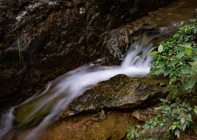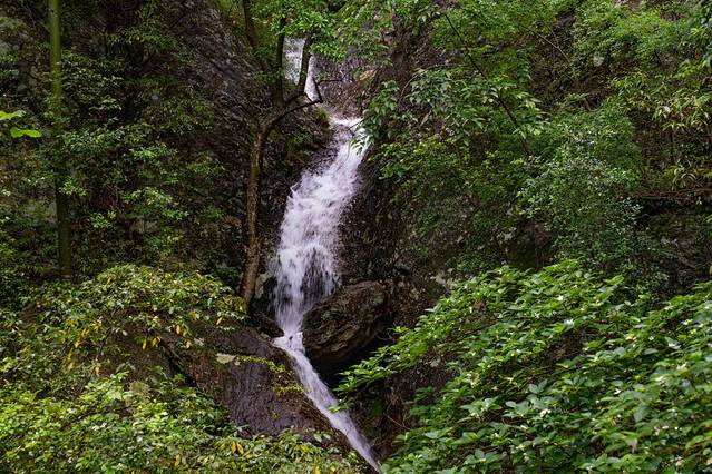 中折瀑很美,有亭子有水池,此瀑在半山腰,形状如农家的灶,人从灶的添柴处出入。中折瀑落差有八九十米,前一晚的春雨赋予了中折瀑更多迷人风采,水柱变得巨大而湍急,像一条长长的银色白练倾泻而下,上似白练,中似白纱,下似飞花,纷纷扬扬,煞是壮丽奇特。瀑布下池水清澈见底。围绕瀑布有一圈小路,漫步其间,可感受凉风习习,还夹杂着水雾,落在脸颊处、手臂处,无比清凉惬意,瞬间驱走了爬山后的热意。石壁上,郭沫若题的我爱中折瀑五字表达了对它的喜爱。