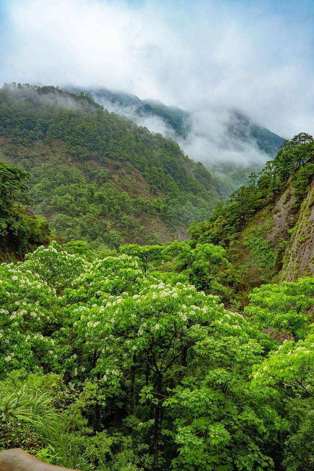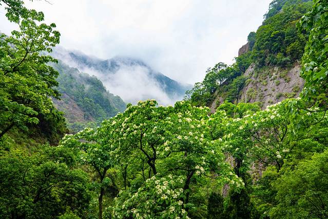 前一晚的一场春雨过后,满地的桐花,粉嫩的花蕊,纯白的花瓣,上面还沾着雨露,含羞带怯柔美清新,而那长长的瀑布,就像仙女挽着的白色玉带,山间弥漫的缥缈云雾宛如面纱,遮住了她的闭月羞花,也遮住了绝美的三折瀑布。