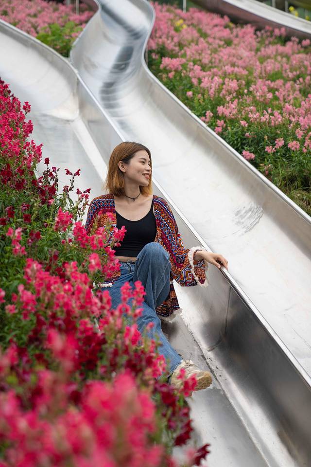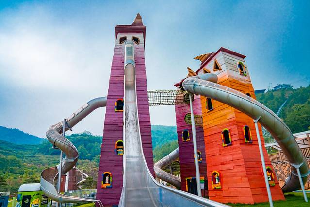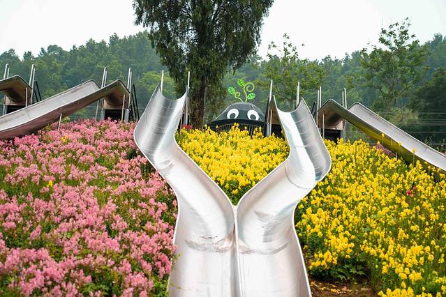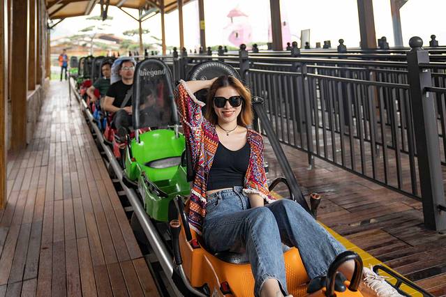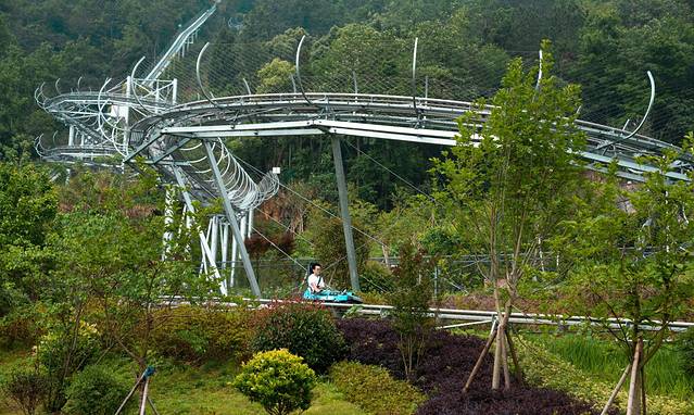 好玩的虎溜溜,我们大伙都去感受了一把,真的是非常刺激!起初在坐虎溜溜车上山的时候,因为坡度很陡峭,实在是让胆小如鼠的我心儿颤了又颤,都有些后悔坐上来,因为要下山只能坐溜溜车从索道中穿梭而下。最后上山登顶后心一横,我选择坐第一辆车下山,原因是前面没人挡,可以尽情饱览如画景色,还因为这个虎溜溜不能停车,停车就会影响后面的溜溜车,但可以自己控制车速,往前是加速,往后是减速,但一定不能往后提到底,提到底就是停车了。在下滑途中有各种弯道,有坡度速度就很快,很刺激,但也有各种平坦的滑段,可以平复忐忑的心情。如果真的是太过于害怕速度过快,可以稍微控制下车速,把两边的把手往上提一点点,就像点刹车一样,轻提轻点,将车速控制在自己能承受的范围内就搞定,毕竟每辆车之间的距离较远,胆子小的乘客稍微慢点也是可行的,但一定不能停车,经验之谈切记切记!