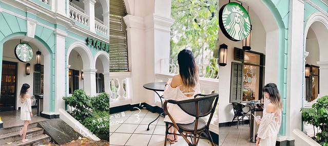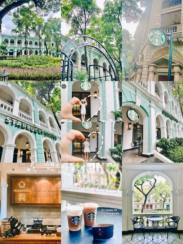 位于沙面岛Tiffany绿的星巴克,很漂亮,颜色很清新,出片效果也很棒,穿白色黄色都不错。