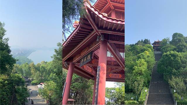 早上8点多吃过早餐后,打个滴滴8元到滕王阁门口,10多分钟就到了,还是很近;8:40开始爬山,差不多1小时左右就能爬到最高处积翠亭,一路上还是边走边拍照;沿途都是石梯路;玉台到积翠亭那段距离就比较陡;滕王阁不收门票,很多老年人在这跳广场舞和喝茶;很是热闹;