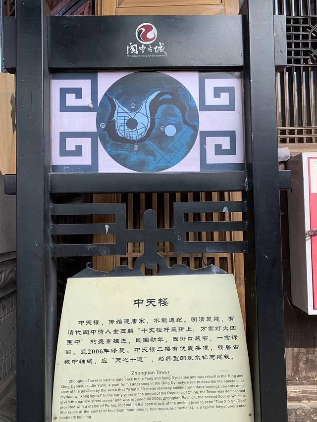 中天楼是一座始建于唐朝的三层明清建筑风格的木质高楼,楼高25米,在一大片古城区中拔地而起,气势恢弘,建造精美。中天楼是 阆中 古城的风水坐标和穴位所在,古城的街道就是以它为轴心的,呈“天心十道”;向四面八方次第展开,因此也将之称为‘ 阆中 风水第一楼’。