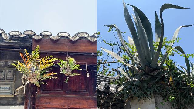 屋檐上挂着植物,不需要土,就靠空气和雨水,也能长得这么好;种在围墙上的龙舌兰也长的很好;旁边还发了很多的小苗;这应该也需要几年的时间吧;还第一次见围墙上种着这么大的龙舌兰;