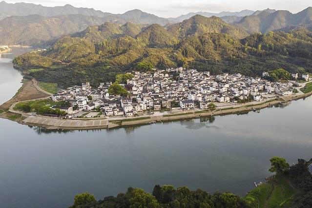 置身其中并不能完整感受到漳潭的美,这里最大的亮点需要从高空俯瞰。漳潭村三面环水,新安江在这里划了一道优美的弧线,就像一把弯弓,将漳潭这片土地紧紧拥抱。