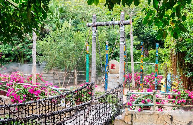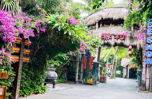 逛了一会儿发现,整个园区真是蛮大的,有可以感受黎族文化的黎村,这里的黎村是在原始黎村的基础上修复而成,上千件古旧黎族生产生活器具陈列于此。在槟榔树的簇拥下,村内的黎族民居船形屋,显得古朴而自然。