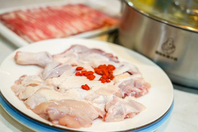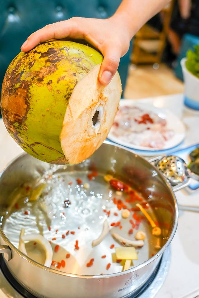 一锅椰子鸡是用整整三个椰子的汁作为汤底,椰子现开,没有加一滴水,鸡肉是超嫩又新鲜的文昌鸡,加入椰汁锅底中,只煮三分钟就可以吃啦。