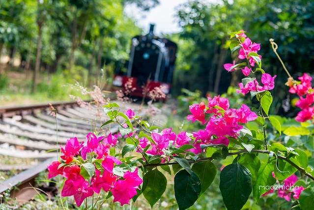 这列火车上写着“天涯海角号”,车头后面只有一节车厢,火车旁边立着一块站牌,上面写着“桶井-马岭”,原来在抗日战争时期, 日本 人在石碌,也就是今天 海南 的 昌江 县,大量盗采富铁矿,利用这条铁路运输线从 海南 岛西部的 昌江 运至南部的 三亚 港后,再用轮船运回 日本 用来冶炼钢铁,制造枪炮。这条铁路就是 日本 占我河山、窃我资源的铁证。抗日战争胜利后,这条铁路成为 海南 岛南部唯一的一条主要运输干线,为 海南 岛的建设立下了不可磨灭的功劳,这条铁路至今己有70多年的历史。