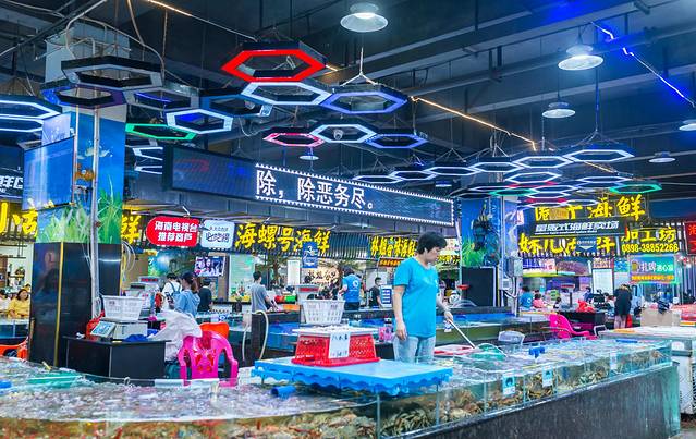亚龙湾的奥特莱斯有一个海鲜广场,晚上超级的热闹,在海鲜市场自行购买海鲜,找一家味道好的海鲜店加工就OK了,加工费明码标价,再也不用担心被宰啦。