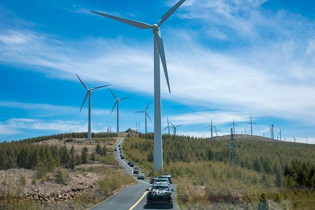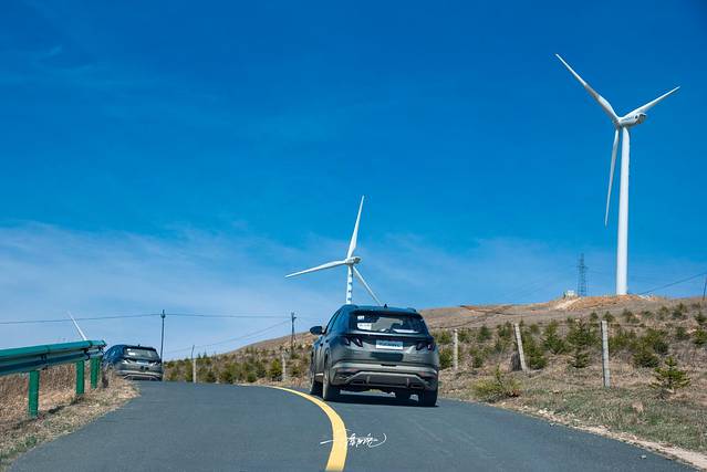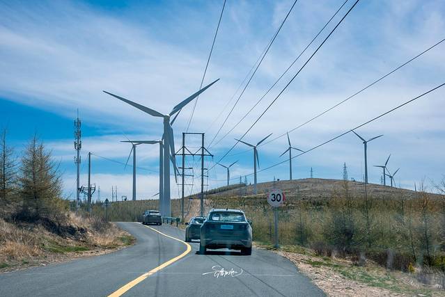 洁白高大的风车是天地间的庞然大物,屹立山头,巍峨壮观。张北的风,呼呼的吹,吹得那风车也心花路放,兴奋得摇摆起来,漂亮的车队穿梭其中,仿佛天路上的一场大party。