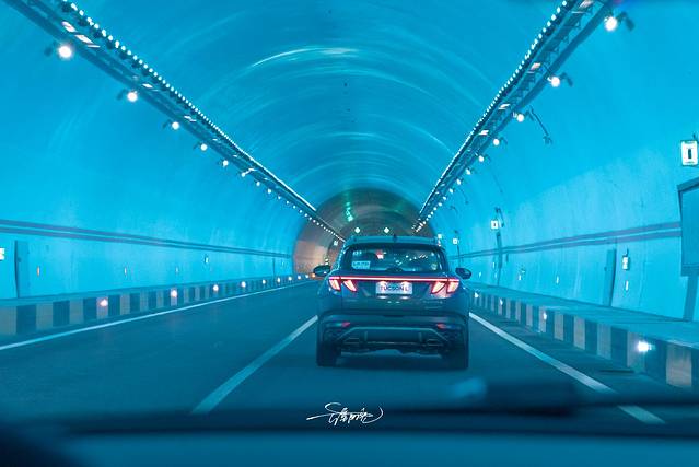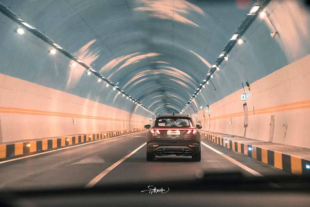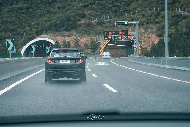 蓝天白云主题的隧道时不时在我们面前出现,与众不同的设计伴着一路酷炫的尾灯,是阴雨天里最美的风景线。