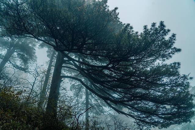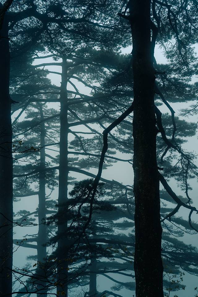 雨雾中的黄山松如墨般在空气中氤氲,或垂直在眼前流下,或在一团流雾中散开,以浓破淡,浓淡之间瞬息万变,定睛看久了,感觉已忘记了时间。