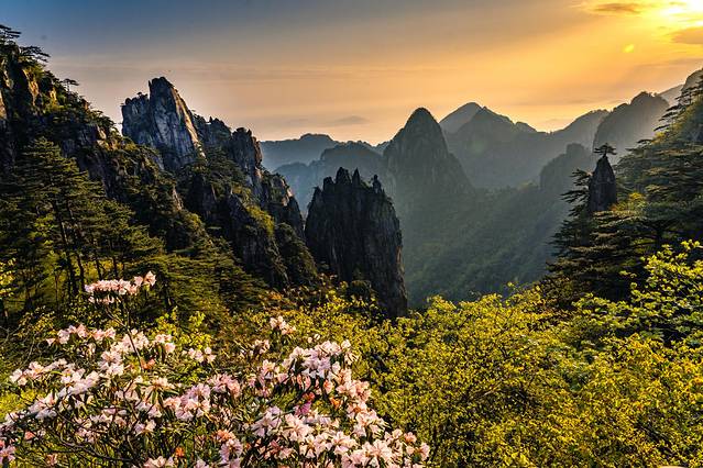 虽然云海不如我们期望的那样壮阔,但听说很多人登六七次黄山都不一定能看到一次像样的日出,此刻眼前的金光四射,让我顿时觉得自己足够幸运。拿起相机各种抓拍,淡淡的云海、黛色的山峰、初醒的黄山松、披着晨光的杜鹃,生怕漏掉属于黄山一日之始的每一个细节。