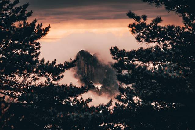 如果说等待日出只有那十几分钟金光照耀的惊喜,那黄山的日落则是一分一秒都不能错过的风景动图。我们沿着台阶一直向上,几乎每一个转角都能透过黄山松的缝隙窥见远处的山形,或一座,或两座,或半遮半掩,或时隐时现,这时的快门已经忍不住开始疯狂按了起来。