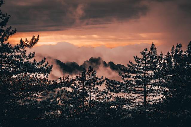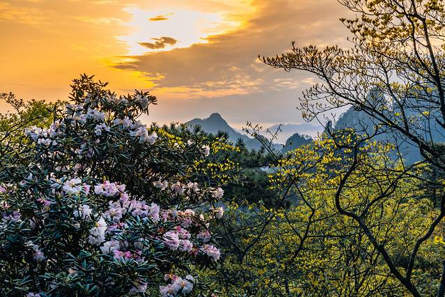 正如“柳暗花明又一村”,本对这样的雨雾天气不抱任何的幻想,但此时的太阳正一点点从阴云密布的天空中散射开来。这时的光线仿佛找到了自己的方向,穿越层层雾气开始将山中的阴霾拨开,隐约显露出那些只言片语的山峰,我知道,一场绝美的日落正在等待着我们。