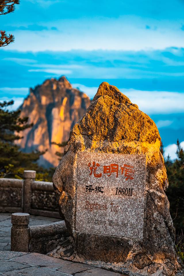 金色的夕阳照在光明顶的石碑上,远处的莲花峰也被映照成金色的模样,宛如一朵金莲盛开。一切都像是雨后大自然最美妙的馈赠,不免俗的与光明顶的石碑合了张影,此时的心情就如拨云见日般舒畅。