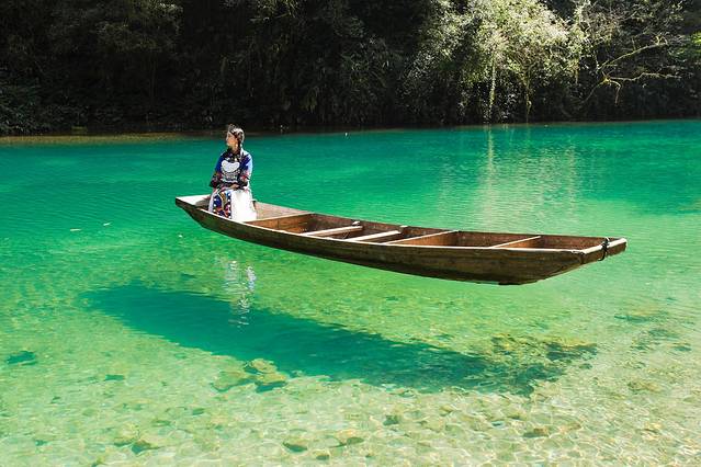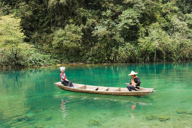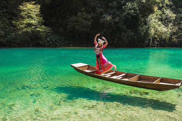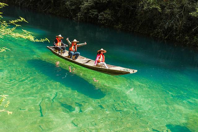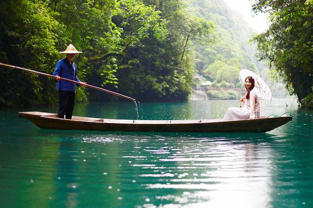 其他时候能不能拍出悬浮照呢?答案是只要水质清澈的时候都可以拍出来,只是相对没那么明显。如果前面一段时间都没怎么下雨,即使当天下了雨也是不影响水质的,当然如果下过暴雨引起上游涨水又另当别论。从季节来说,冬天的水质是最清澈的,即使没有阳光,也能拍出效果不错的木船悬浮照。需要说明的一点,上小木船拍摄悬浮照需要在阿打铺子买票排队,20元/人/次,30元/船/次(不超过3人),也可以购买100元/船(不超过3人)的小木船太空体验游船票,可在水域内划一圈。