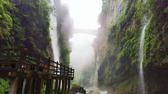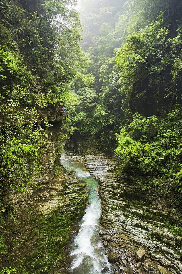 恩施地心谷属世界珍奇高山喀斯特岩溶嶂谷地貌,以“险、奇、古、野、秘、秀”著称,峡谷幽深,天桥凌空,时空穿越的巴盐古道地心天堑胜迹遍布,河谷内石臼涡槽极具特色,素有“地心归来不看谷”之称。下雨的地心谷山间雾气缭绕,飘飘欲仙,更显灵秀。