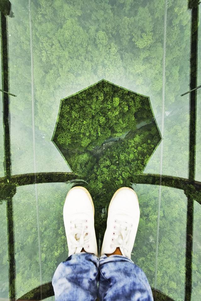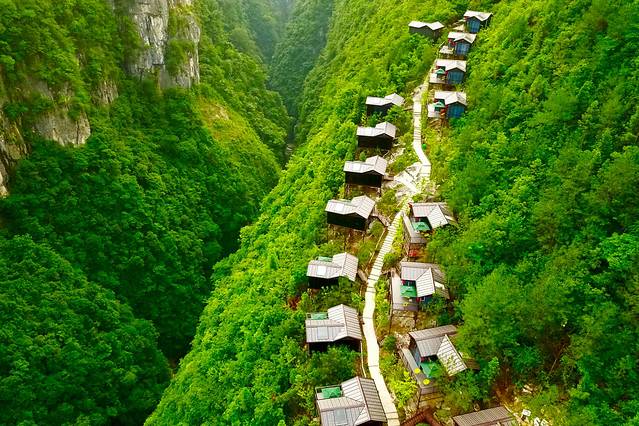 恩施地心谷景区入口附近有一排名为“崖舍”的网红临崖玻璃民宿,朝看晨雾夜观星空,也是吸引很多人来到这个景区打卡的重要原因。