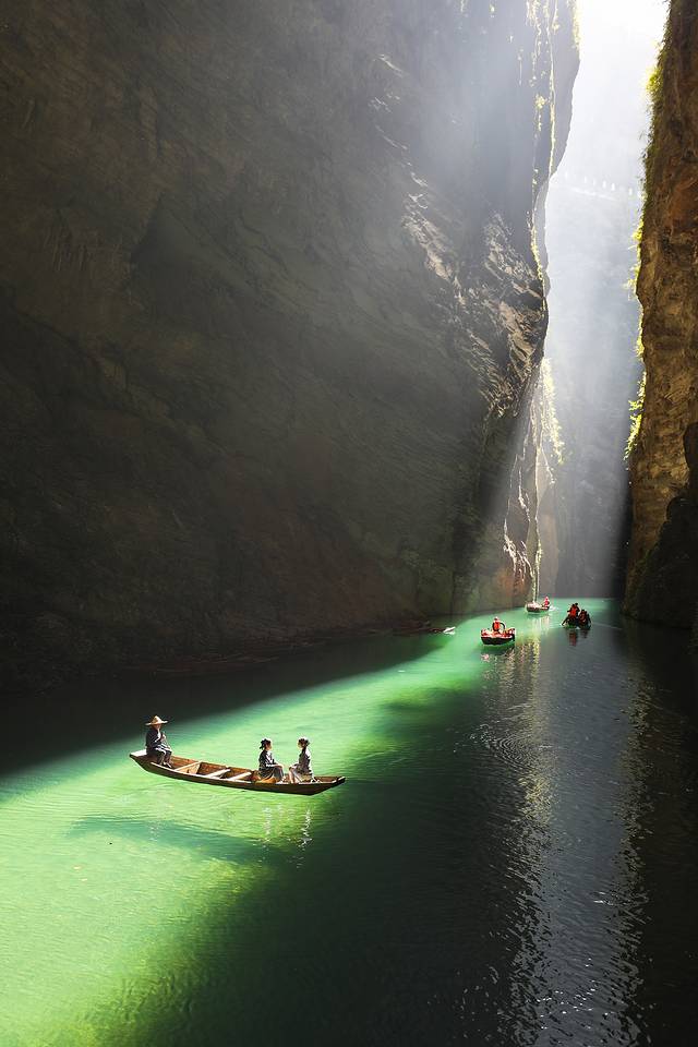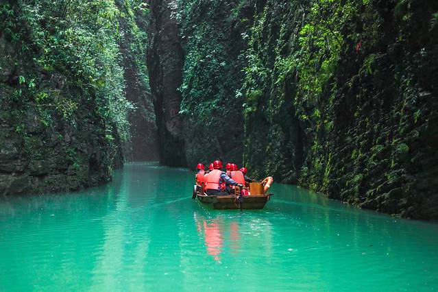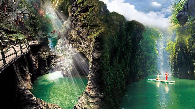 除了拍摄悬浮照,屏山峡谷还有什么可看可玩的?首先是恩施所有峡谷都有的绝壁栈道——云罡栈道,在栈道上就可以将整个峡谷景观一览无遗。其次,夏季早晚温差大的时候,水面会升起一层薄雾,船行水面,仙气十足。最后也是最重要的一点,从桃花渡码头乘坐交通船穿行一线天,穿过五尺门,途经望月桥,穿过黑龙渊的一段船程,是我个人认为屏山峡谷景区最精华的一段风景,在静谧幽深的峡谷中穿梭,耳边只能听见船身划破水面的声音,就如进入了与世隔绝的梦境一般不愿醒来,也难怪有部分游客坐了一趟船还不够,现场要求加钱再坐一趟。