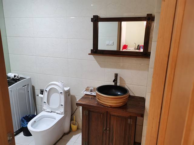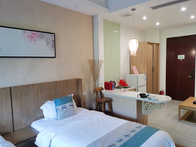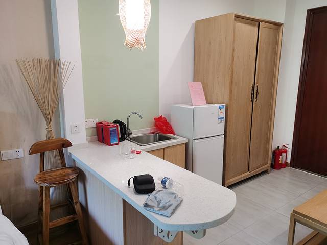 住房外观都是仿日式,装修是现代化的,一楼的客房有个小庭院,可以喝茶休息。客房设备齐全,有冰箱洗衣机,还有个小吧台。