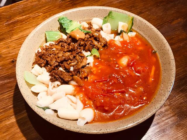 擦圪斗(擦蝌蚪),平遥民间最家常的一种面食,名字就很有地域特色。特别留意了一下,天元奎的面案师傅用一种特制的工具,把和好的面团擦进锅里煮,然后用笊篱捞进碗里,浇上或肉或素的臊子,成就了一碗当地特色面。我试想了一下,也许是因其形似蝌蚪(当地人方言“圪斗”)得名的吧。