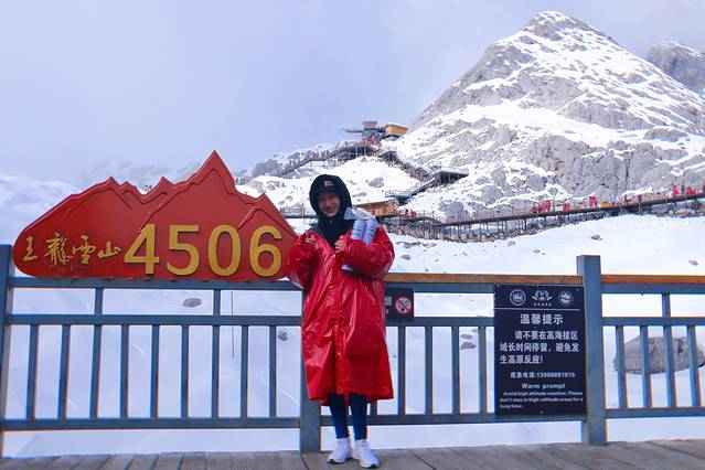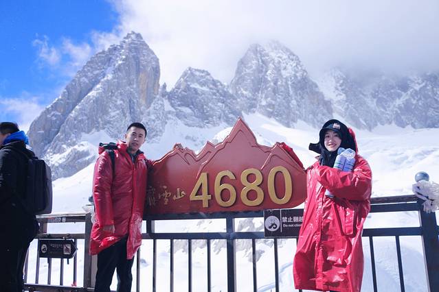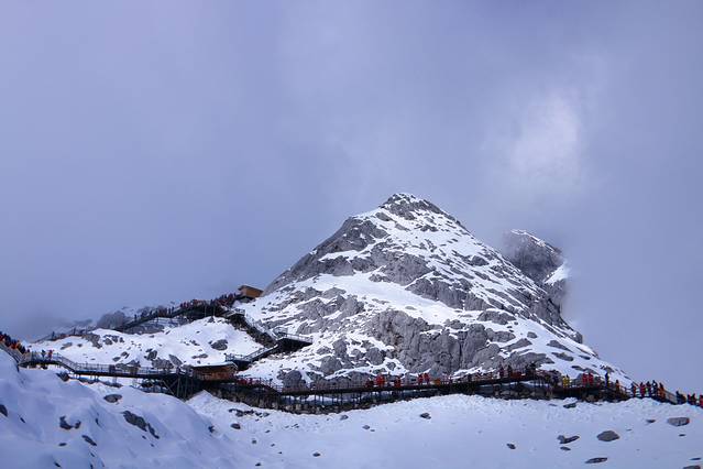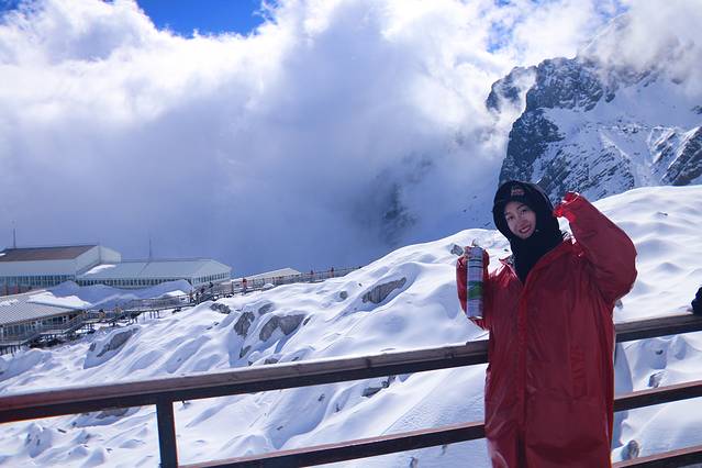 都说美好的风景往往需要付出最多才能看到,确实是,爬到雪山栈道最高处,此时已深入云站在海拔4680米处,下面是冰川公园全景,上面是白雪皑皑的雪山,玉龙雪山的一切尽收眼底,为之所有的付出都变得值得。