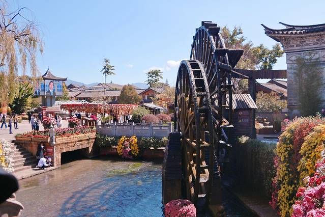 大水车早已成为古城的标志性建筑,一大一小的两架水车昼夜不息地在玉河上转动着,它们掬起清澈的河水又抛下,用“大珠小珠落玉盘”的水声为这座沉稳的古城增添着一份灵动的气息。