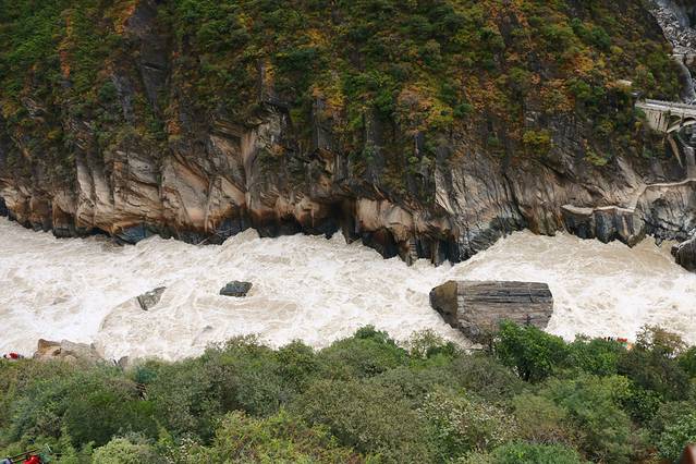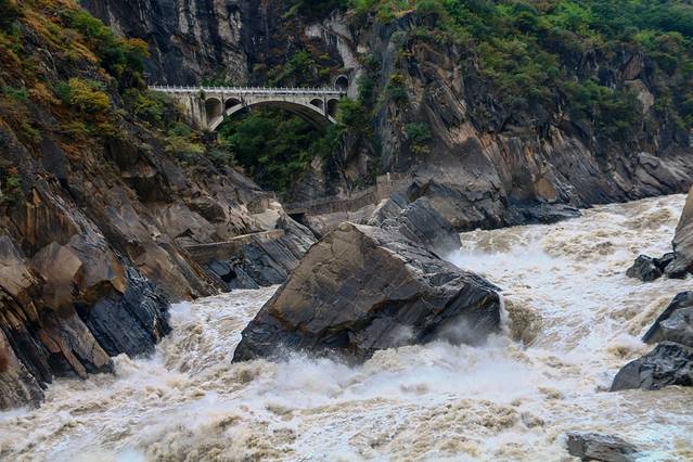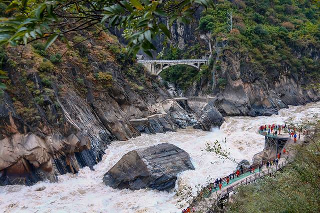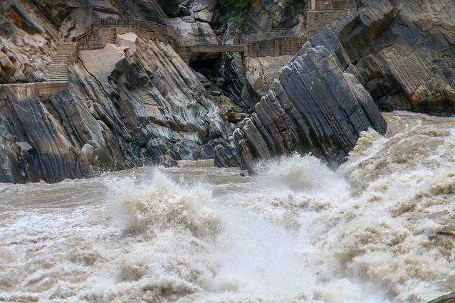 这里山险水险,东有海拔 5596 米的玉龙雪山,西有海拔 5396 米的哈巴雪山,两岸山体陡峭,犹如刀砍斧削一般。江中礁石林立,险滩密布。从上虎跳峡至下峡口,江流湍急、瞬息万变,或狂驰怒号、石乱水激,或旋涡漫卷、飞瀑轰鸣,站在观景台上,静静地看着,一起的烦恼都会烟消云散,也会感慨人类的渺小,当你高兴或不高兴,站在那里一切都变得豁然开朗。