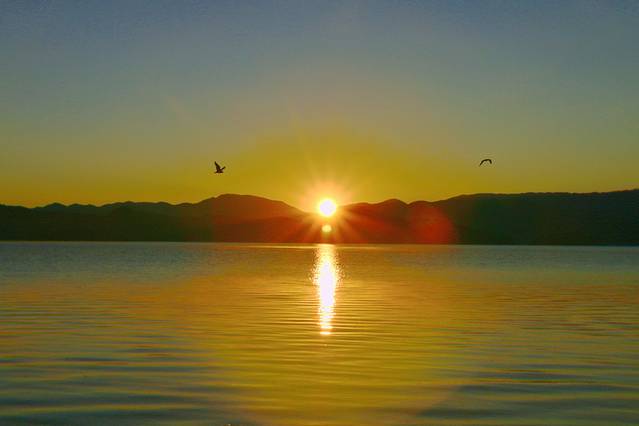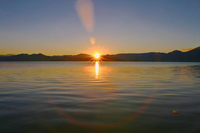 太阳慢慢升起,泸沽湖一瞬间充满生机,一道初生的曙光,普照这片美丽的女儿国。原来,美就在不经意之间,湖面波光粼粼,太阳露出脑袋,阳光轻柔的照耀在湖面上,太阳仿佛拖了小尾巴,此刻,甚至有些不想举起相机,只想安静的享受这一刻,因为相机也拍不出眼镜所看到的美。