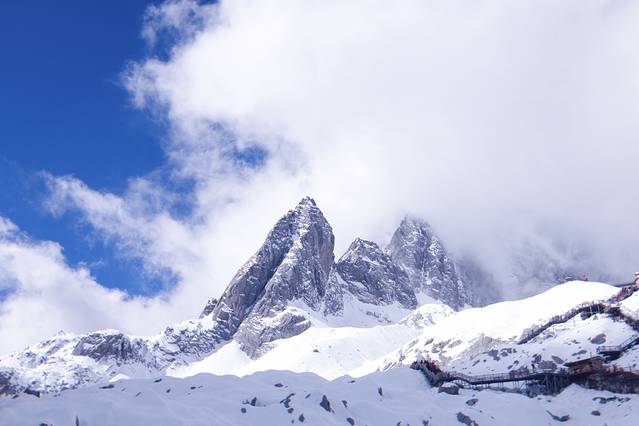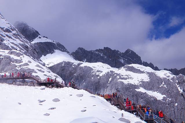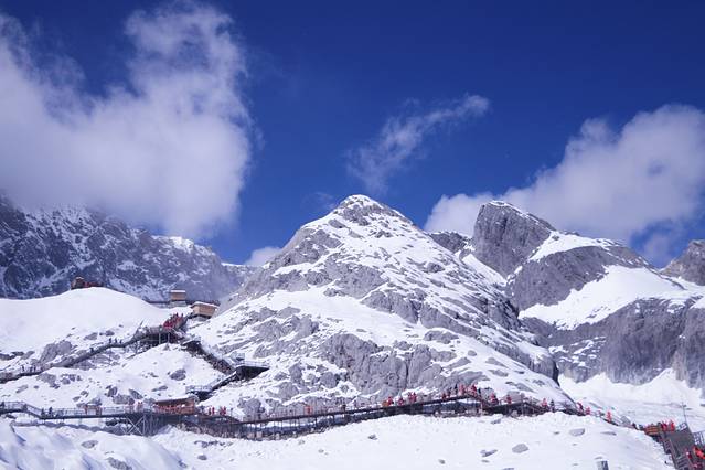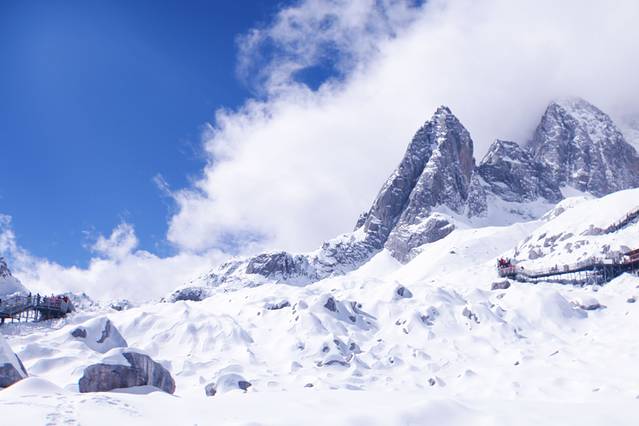 登上雪山,这完全是另外一个世界,仰望玉龙雪山最高峰扇子陡,让人忍不住惊叹大自然的鬼斧神工,环顾四周,白雪茫茫,雪山栈道蜿蜒而上,一幅壮丽的水墨画浑然而成,这里不似在人间,好似一手能抓住云彩。