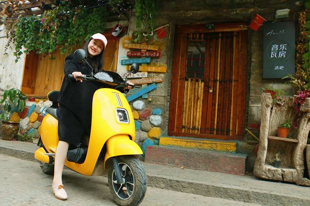 我们提前一天预订的黄色电瓶车,第二天7点钟取得车,提前规划好路线,从古城出发,出发前买古城里特意拍了照片留作纪念。